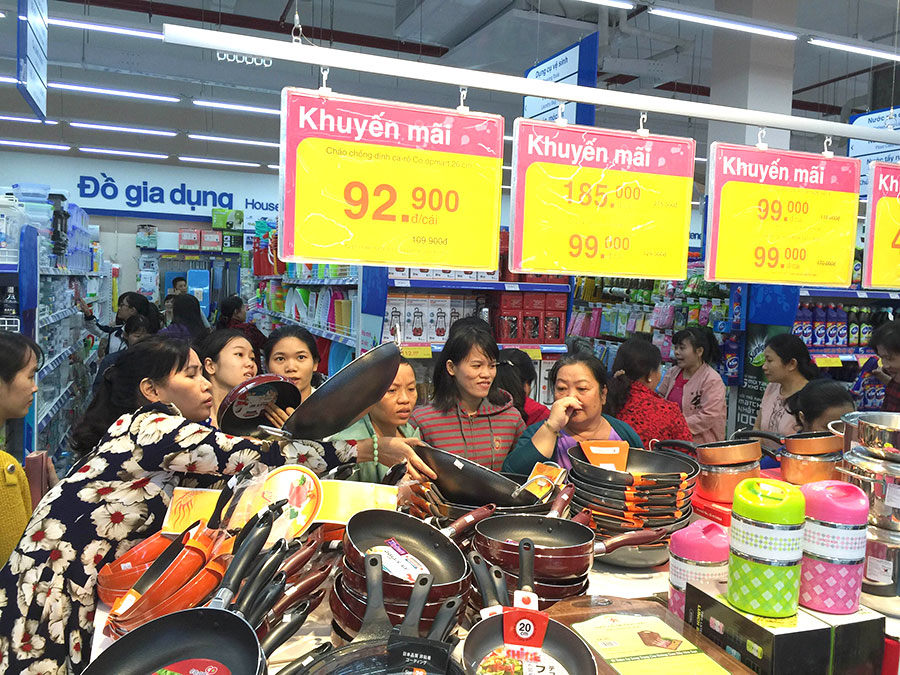 Một góc trưng bày đầy đủ các loại chảo chống dính, inox, giá khuyến mãi nổi bật bằng bảng đỏ. Các bà nội trợ chăm chú lựa chọn, tay cầm thử sản phẩm, tạo nên khung cảnh sôi động và hấp dẫn.