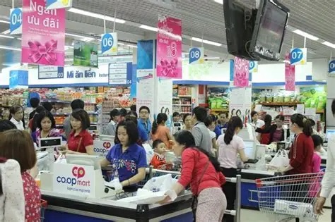 Tòa nhà với biển hiệu “Coopmart” màu xanh hồng nổi bật, phía trước là bãi giữ xe gọn gàng, khách hàng ra vào tấp nập.