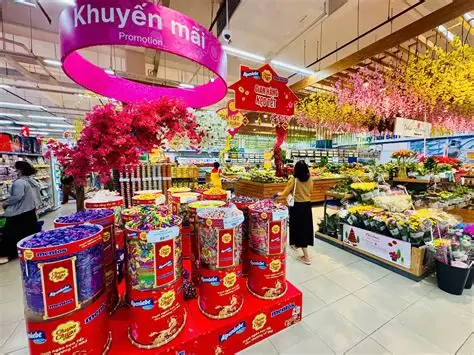 Dãy kệ bánh kẹo nhiều màu sắc, hộp quà Tết được sắp xếp gọn gàng, dễ nhìn. Khách hàng thoải mái chọn lựa, không khí rộn ràng gợi cảm giác chuẩn bị cho mùa Tết sum vầy.