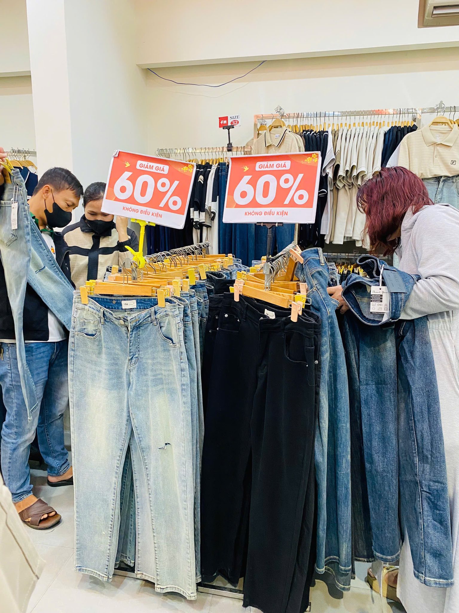 Khu vực quần jean giảm giá tại FM STYLE luôn thu hút rất đông khách lựa chọn. Mẫu mã đa dạng, form đẹp, dễ mặc, mức giá ưu đãi sâu nên khách hàng thoải mái xem, thử và mua sắm nhộn nhịp suốt cả ngày.