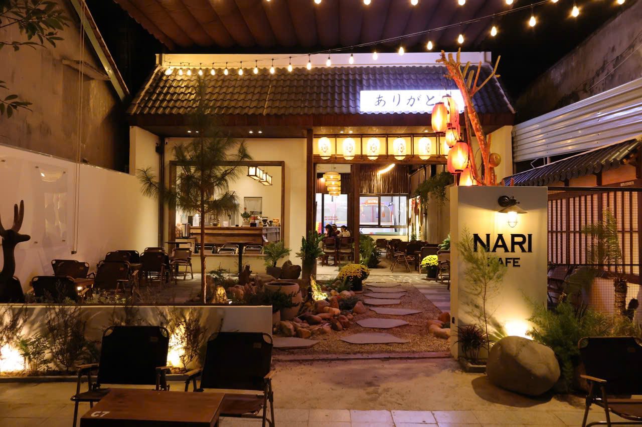 Giữa nhịp sống yên ả của Kon Tum, Nari Kafe hiện lên như một góc Nhật Bản thu nhỏ với mái ngói, đèn lồng và ánh sáng vàng dịu mắt. Không gian bên ngoài được thiết kế tinh tế, vừa mộc mạc vừa ấm cúng, khiến người ta chỉ muốn bước chậm lại để tận hưởng. Buổi tối ngồi trước hiên quán, gọi một ly cà phê và ngắm quán lên đèn, cảm giác bình yên lan tỏa rất tự nhiên, rất dễ chịu.
